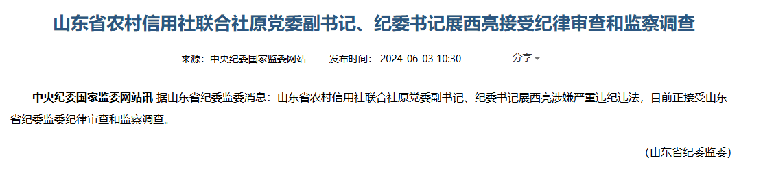 中国网财经6月3日讯今日,中央纪委国家监委网站显示,配资网平台据山东省纪委监委消息:山东省农村信用社联合社原党委副书记、纪委书记展西亮涉嫌严重违纪违法,目前正接受山东省纪委监委纪律审查和监察调查。