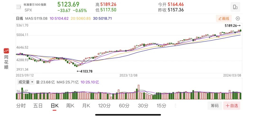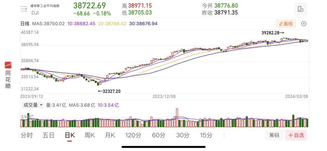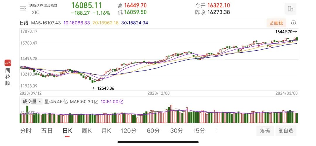 当地时间3月8日,美股三大股指均在开盘上涨后转跌。截至收盘,道指跌0.18%,报38722.69点;标普500指数跌0.65%,报5123.69点;纳指跌1.16%,报16085.11点。